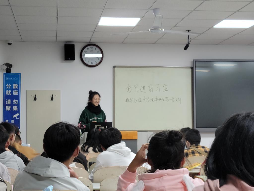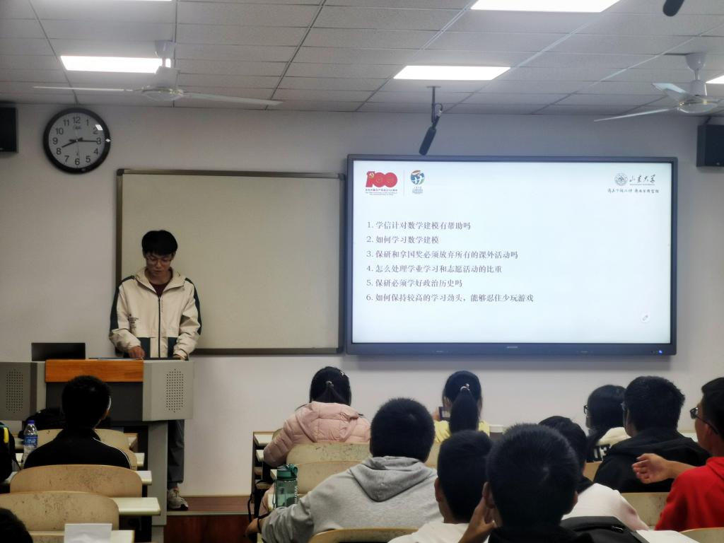 活动前期,党支部书记王祎璠同志将党员同志分成四个小组,分别进入2021级数学类四个班级自习室开展本次活动,各小组通过问卷搜集了各班新生当前学习生活的困惑和疑问。活动中,党员同志围绕专业学习、科研创新、社会实践等方面进行了经验分享,对入党流程、学院学生管理制度等进行了讲解。其中,岳明祖同志结合自身推免经历,提出需要打好数学专业课基础,在学好专业课的同时也要注意多个方面的均衡发展;许健源分享了个人数学建模竞赛的经历和科研经历,鼓励新生要主动学习、勇于尝试,注重在本科阶段培养自身的科研素养;崔永东围绕班级建设,分享了个人学生工作的体会和感悟,对平衡学生工作和专业学习提出了见解。党员同志们的用心分享和耐心解答受到了同学们的欢迎,活动最后,同学们添加了党员同志的联系方式,方便今后的交流答疑。本次活动氛围融洽,党员同志们准备充分,各班新生参与积极性高,均表示收获颇多。