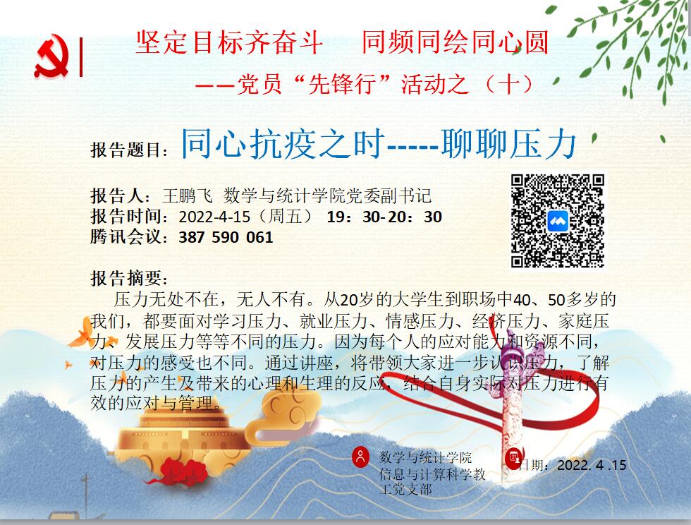 本站讯 为了帮助师生缓解近期产生的各种压力,2022年4月15日晚,beat365中国唯一官网信息与计算科学系教工党支部于腾讯会议举办“坚定目标齐奋斗 同频同绘同心圆——党员‘先锋行’报告之(十)”活动。本次活动由信息与计算科学系教工党支部书记亓兴勤主持,学院党委副书记王鹏飞主讲,学院教师及学生140余人参加。