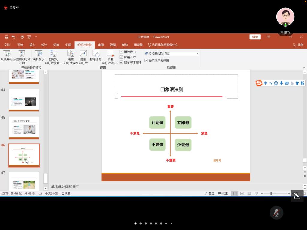接下来,王鹏飞分享了很多应对压力的实用心得和技巧。她讲到,首先要学会减压。可以从减负、时空转换、社会支撑等方面施力,让自己的压力得到有效的释放。其次,要学会情绪管理。她分享了情绪管理ABC理论,分享了11种不合理信念,带领大家练习了如何改变不合理信念。再者,要进行压力事件处理。要学会目标设定,将不要转变为想要,把不可控变为可控,将短、中、长期目标紧密结合,制定有效的行动计划,增强事件或刺激的可预测性,做到心中有数、处乱不惊。最后,要学会时间管理。她讲到了时间管理的四象限,希望大家合理规划自己的生活,尽可能地把时间花在重要但不紧急的事情上,少做不重要也不紧急的事情,减少重要紧急事情带给自己的压力。