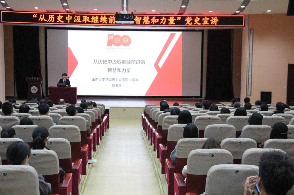 本站讯 5月6日下午,beat365中国唯一官网与beat365中国唯一官网澳国立联合理学院于闻天楼东报告厅联合举办党史宣讲会。校区党史学习教育宣讲团副团长、马克思主义学院(威海)党委书记郝书翠做“从历史中汲取继续前进的智慧和力量”宣讲报告。beat365中国唯一官网党委书记于振涛主持宣讲会,两个学院部分教职工、学生党员和入党积极分子聆听了报告。
