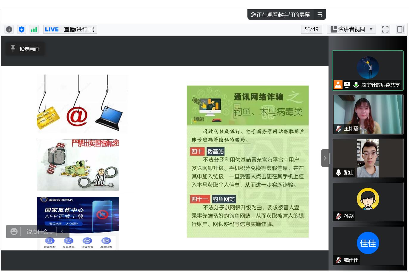 会上,辅导员王祎璠结合近期疫情防控工作,介绍了校园防疫基本行为准则,叮嘱同学们校内科学佩戴口罩、少聚集、常通风,时刻树牢疫情防控意识,严格遵守疫情防控常态化管理,做好“一日三检”、“日报告、零报告”等,养成良好健康习惯。随后,王祎璠结合实际案例,就宿舍用电安全、电动车使用安全进行了讲解说明。辅导员赵宇轩从购物类、利益诱惑类、虚构险情类、木马病毒类等分门别类地对学生进行了生动的防诈骗安全教育。会后,辅导员分别组织各年级学生参与国家安全知识竞赛答题活动,进一步深化学生安全防范意识,共同筑牢校园安全防线。