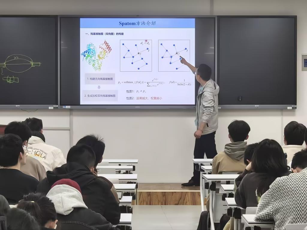 柳军涛以“生命科学中的数学问题”切入主题,结合相关的课题研究进行了深入浅出的讲解,分享了生物信息学的相关知识,着重谈到了数学在生命科学研究中的作用发挥。他分别以研究领域“转录组拼接”和“蛋白质间的相互作用”为例,生动地讲述了RNA的剪切与拼接这一生物过程和数学方法在蛋白质作用位点识别上的预测思路与相关算法。柳军涛讲到数学在生命科学领域应用广泛,数学方法在生命科学相关问题的研究和分析上具有独特优势。他鼓励学生要加强学科交叉学习研究,学会用数学问题去解决各种现实问题。在现场交流互动环节,柳军涛就大家的提问和困惑进行了详细而又生动的解答。