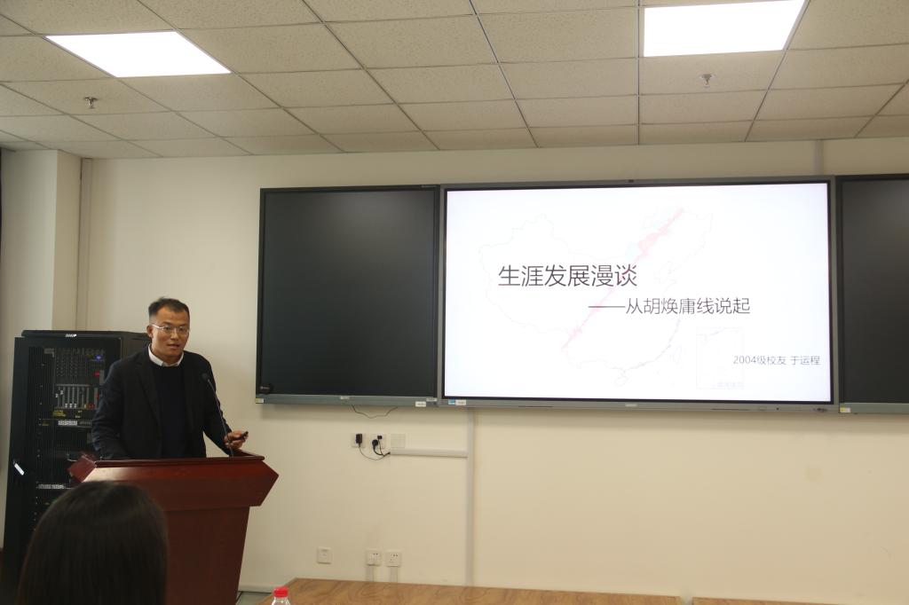 2004级校友、运筹数据技术(临沂)有限公司总经理于运程首先进行了分享。他从胡焕庸线切入,指出人口密集之处往往有更多的发展机遇。他引用地质学中的概念,生动形象地阐述了压力、时间和希望对于个人成长的重要性,鼓励同学们珍惜当下,不断提升综合素质。