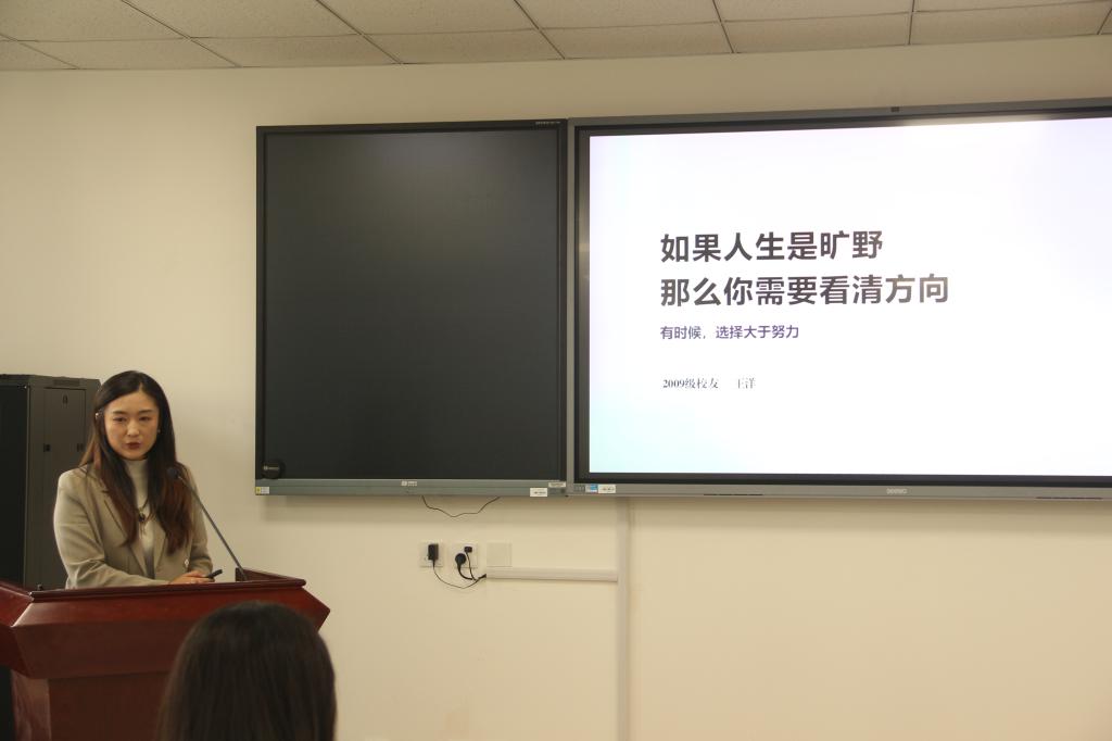 2009 级校友、中共威海市委教育工作办秘书科副科长王洋回忆了自己多赛道求职的经历,强调了职业选择的重要性,综合分析了考研、就业、考编等不同发展路径的特点,就考公考编的准备和注意事项进行了重点分享,并鼓励同学们勇敢选择尝试,保持积极心态,享受人生旅程。