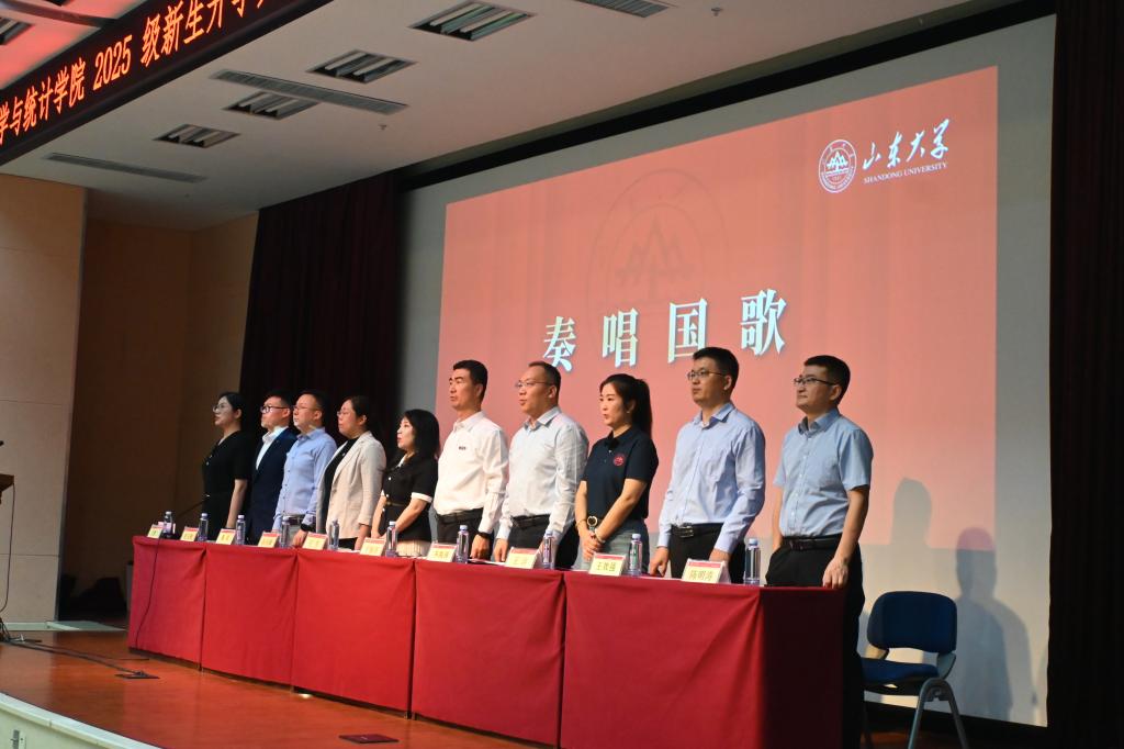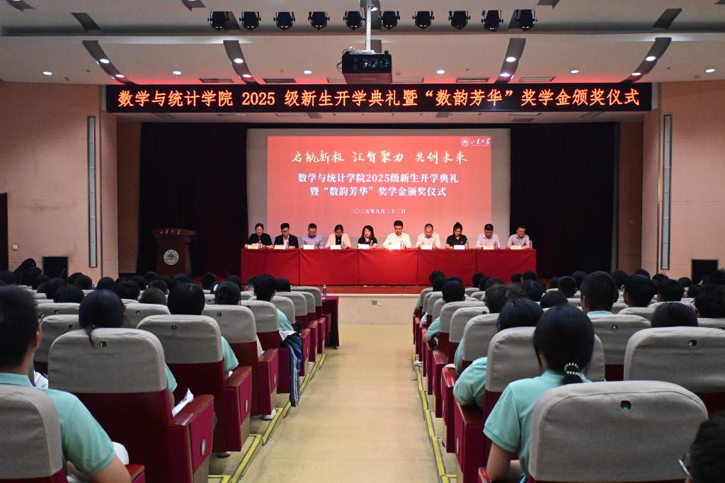 2025年9月22日晚,beat365中国唯一官网2025级新生开学典礼暨“数韵芳华”奖学金颁奖仪式在闻天楼东报告厅举行。校区党工委副书记、学院党委书记于振涛,2010届校友王芳,2013届校友王洋,院领导班子成员及教师代表、辅导员、2025级新生参加典礼。典礼由党委副书记王鹏飞主持。
