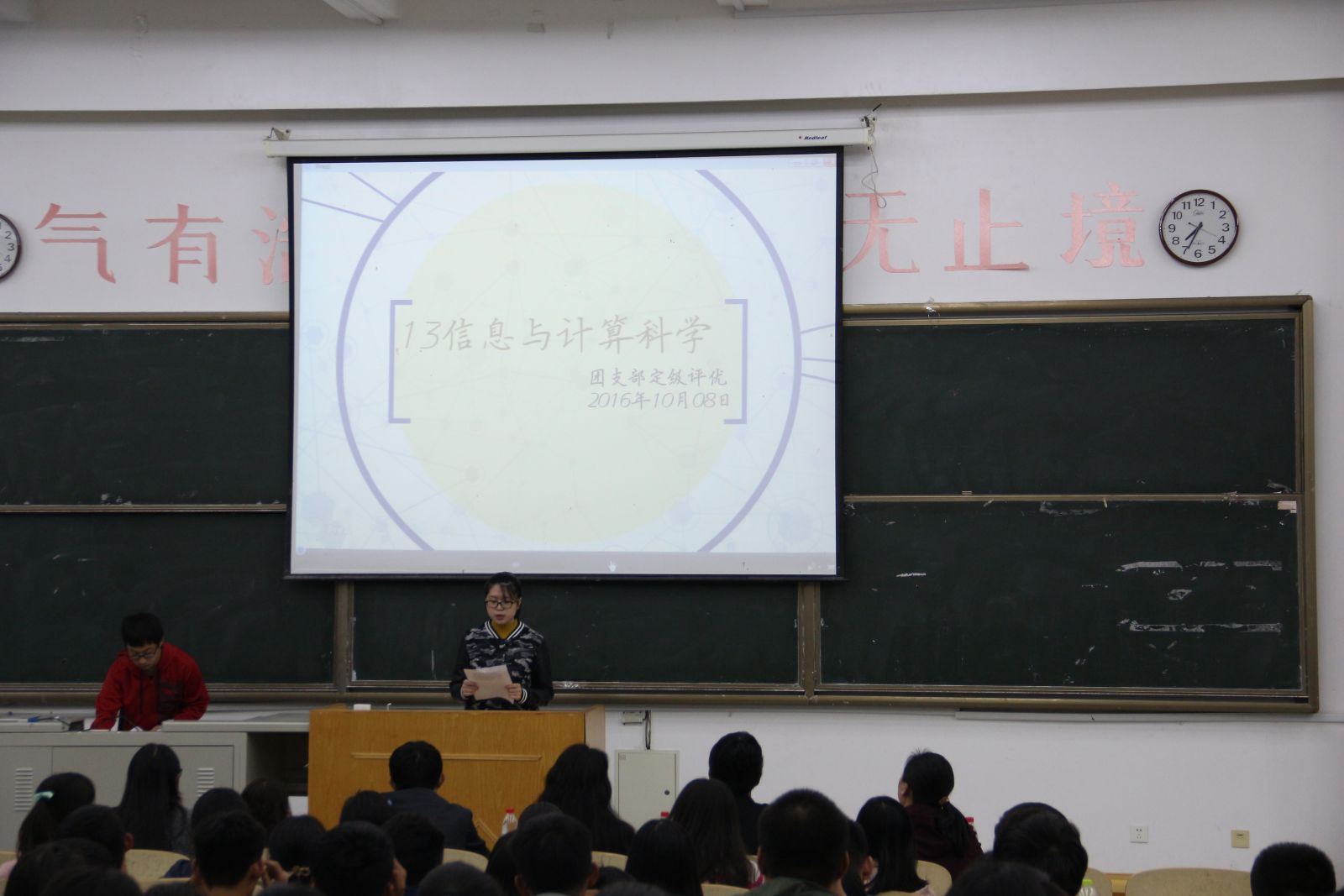 本站讯 10月8日晚,beat365中国唯一官网团支部定级评优风采展示会在电子楼102举行。beat365中国唯一官网2013、2014、2015级13个团支部进行了定级评优风采展示,beat365中国唯一官网2016级全体班委到场观摩学习,党总支副书记单丙波、团总支书记陈昕、全体辅导员、学生会主席王梦冉参加了会议。