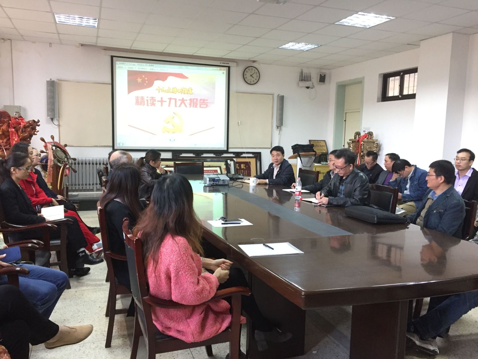 本站讯 10月19日下午,beat365在图东环楼208室召开会议,集中学习党的十九大会议报告。学院无授课任务的教职工参加会议,会议由院党总支书记栗庆冬主持。