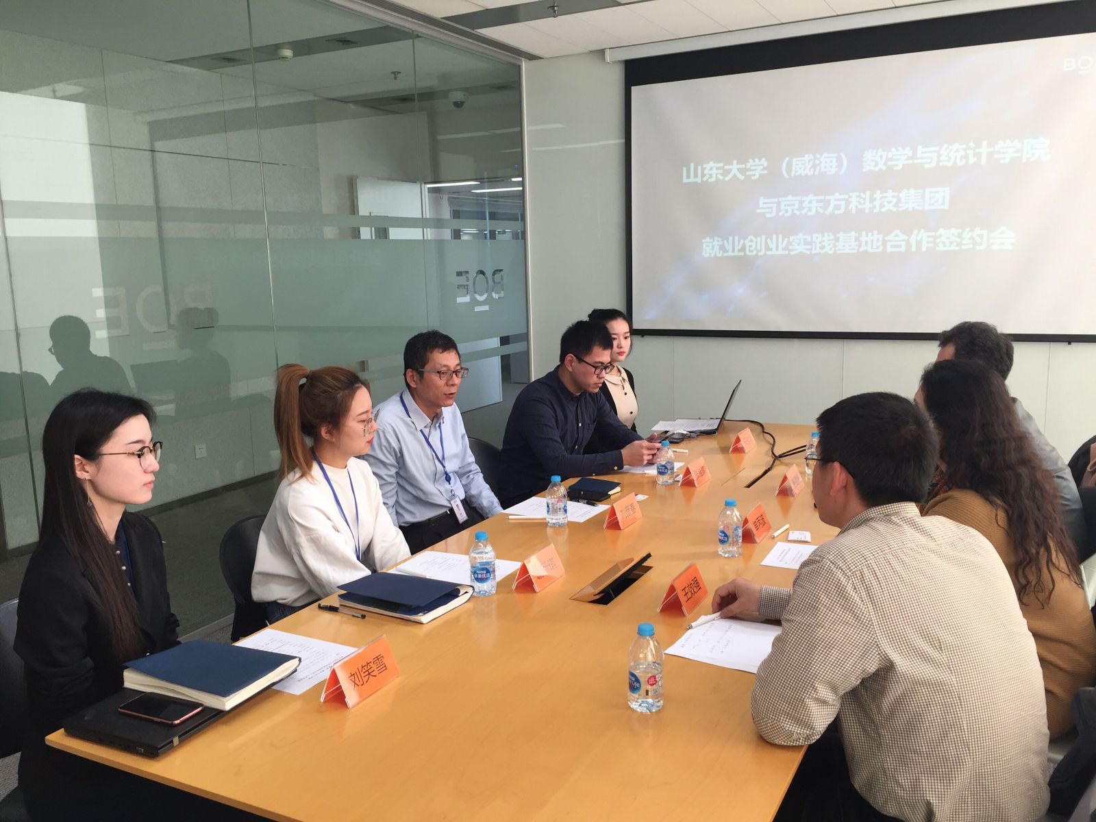 本站讯 为进一步加强校企合作交流,了解就业单位人才需求,拓宽学生实习就业渠道,12月17日,beat365党委书记单丙波、常务副院长綦建刚、统计系主任王效强、辅导员王祎璠于北京走访了京东方科技集团股份有限公司和北京中体骏彩信息技术有限公司,并签署就业实践基地。