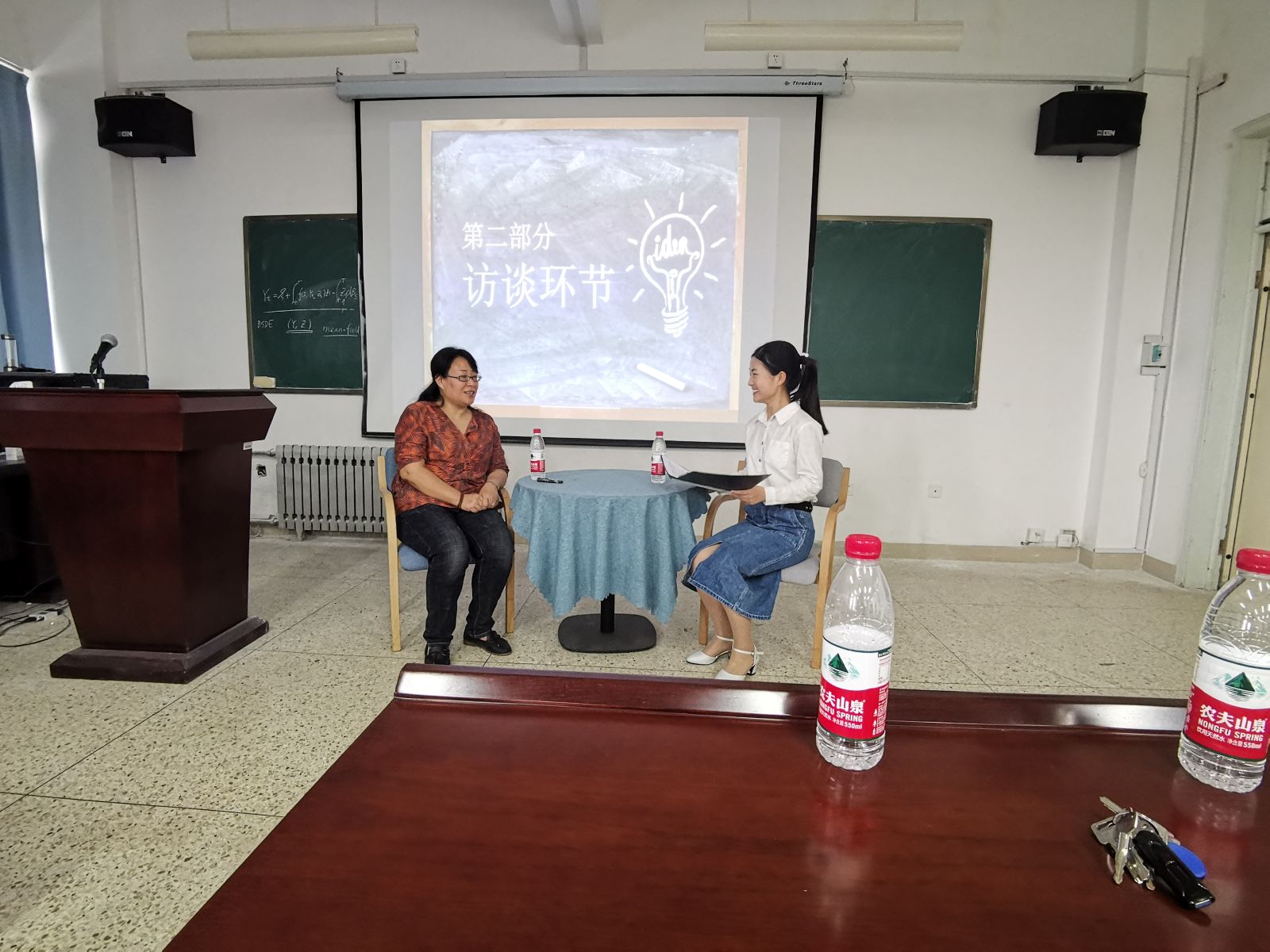 董珂介绍了本次讲座的主讲人李娟教授后,座谈会正式开始。李娟教授首先介绍了她的导师彭实戈院士,告诉同学们拥有一位良师的重要性,并且以彭实戈院士的研究经历告诫同学们无论做什么事情都要脚踏实地的付出努力。谈到自己,李娟教授以求学科研经历为切入点,分享了她是如何在数学领域一步步取得今天的成绩,并屡次强调“贵在坚持”这一品质的重要性。之后,李娟教授向同学们讲解了自己目前的研究方向与科研领域,联系现实生活阐述了数学在生活和工作中都有着非常重要的作用,能够学好数学就可以做很多事情。在访谈环节,李娟教授针对主持人提出的各类问题,为同学们提供了今后学习发展的建议,言谈既直白生动,又引人深思,获得在场观众热烈的掌声。在最后的提问环节,她耐心为到场同学解答了心中的疑惑。至此,本次“励志周末”讲坛正式结束。
