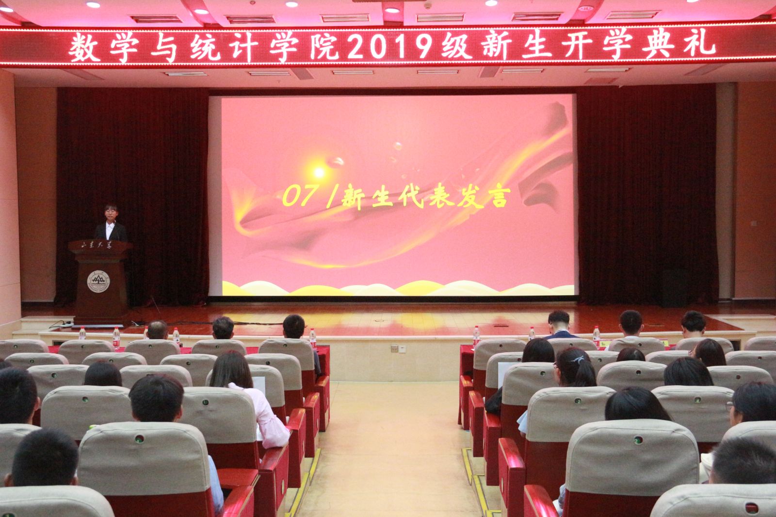 开学典礼在庄严的国歌声中拉开帷幕。常务副院长、党委副书记綦建刚代表学院致辞,他对全体新生表示热烈的欢迎与祝贺,并为大家介绍了学校和学院的基本情况,强调了数学作为基础学科的重要性与发展前景。綦建刚从“何为大学”的问题出发,结合beat365中国唯一官网“为天下储人才,为国家图富强”的办学宗旨,殷切期望全体新生树立“大我”的爱国情怀,将“小我”的人生目标融入“大我”之中,用积极主动的态度、知难而上的勇气投身实现中华民族伟大复兴的中国梦。教师代表、信息与计算科学系主任张旭,结合自己的学习经历,告诫同学们要扎实学习、打好数学基础,切勿急功近利,同时要树立远大理想,脚踏实地去奋斗。随后,老生代表2017级数学与应用数学专业学生魏佳佳发言,表达了对新生的祝福,并分享了自己大学生活的感悟,鼓励新生懂得坚持、不断进取,为自己的梦想而奋斗。新生代表王肖晴表达了对学院教师、学长学姐的感谢与祝福,表明新生定会不负众望,努力奋斗,立志成为山大的骄傲。