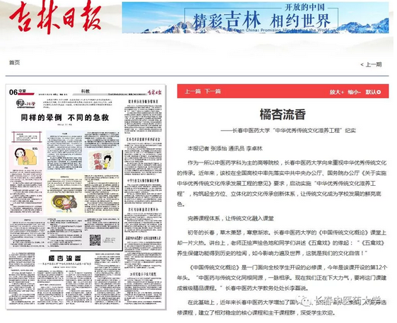 今日(11月27日),《吉林日报》第6版以《橘杏流香》为题报道了我校实施“中华优传统文化滋养工程”的特色做法与成效。