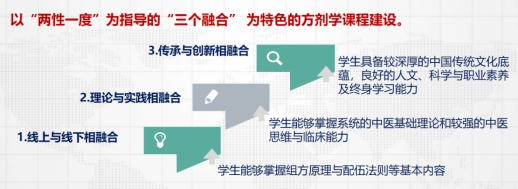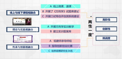 方剂学教学团队始终秉承着“读经典、学名方、做临床”这一教学思路,坚持立德树人,坚持以学生为中心,开展形式多样的教学活动,实现了线上与线下相融合、理论与实践相融合、传承与创新相融合的“三融合”的线上线下混合课程的建设,提升教学效果。