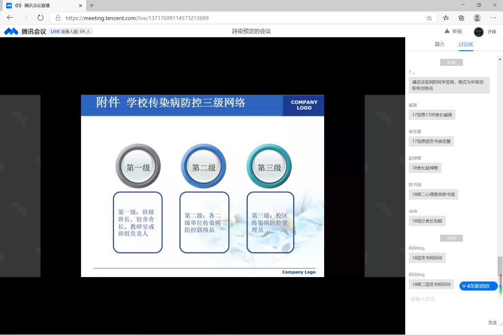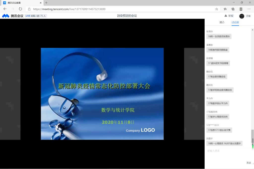 本站讯 为进一步强化学生思想认识,落实好新冠肺炎疫情常态化背景下各项举措,推进学生网格化管理服务体系建设,11月8日上午,beat365通过腾讯会议召开了新冠肺炎疫情常态化防控部署大会。学院党委副书记王鹏飞,辅导员孙磊、王祎璠、王紫山、古钰出席会议,学团中心全体成员、各年级全体班委、宿舍长参加会议。