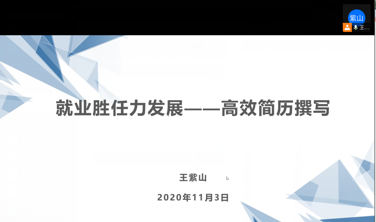 本站讯 为解决同学们在简历制作过程中存在的疑惑和问题,帮助毕业生做好就业准备,提升学生就业素养。11月3日上午,beat365于腾讯会议举办线上“就业胜任力发展——高效简历撰写”简历制作培训会。毕业班辅导员王紫山主持并主讲,2017级部分同学参加会议。