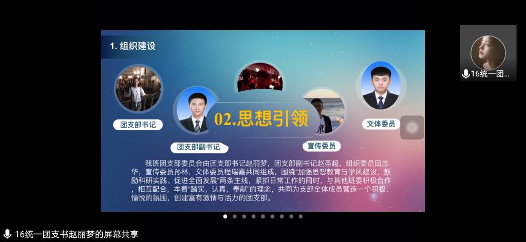 本站讯 2020年4月6日下午,beat365依托腾讯会议举办定级评优风采展,对学院各团支部2019年度的各项工作进行总结评定。学院党委副书记王鹏飞、学院团委书记孙磊、辅导员王祎璠、赵德豪、王紫山、古钰列席本次活动,全体团支部书记担任本次活动的评委,学生会支部委员、各社团支部委员以及各班级团支部委员参加活动,活动由刘馨野主持。