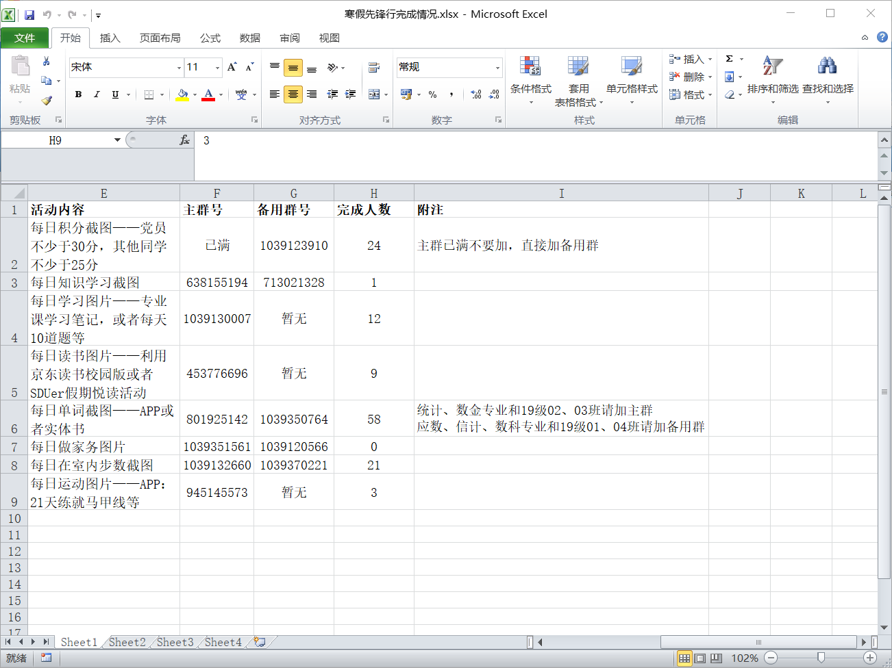 本次寒假先锋行打卡活动分为学习和运动(室内)两类共8种活动方案。学习类包括学习强国打卡、每日疫情知识学习、每日学习、每日读书、每日单词等五项。运动类(室内)包括每天做家务、日行2000步、每日运动等三项。每个项目设置负责人4人,负责项目的监督和打卡统计。每个项目根据各自情况建群1-2个,一般标准为50人/群,具体如何建群由负责人商定。打卡方式主要是截图或图片:学习强国打卡要求上传每日积分截图——党员不少于30分,其他同学不少于25分;每日疫情知识学习需要上传每日知识学习截图;每日学习要求上传每日学习图片——专业课学习笔记或者每天10道题等;每日读书是上传每日读书图片——利用京东读书校园版或者SDUer假期悦读活动;每日单词是上传每日单词截图——APP或者实体书;每天做家务的要求是上传每日做家务图片,日行2000步是上传每日在室内步数截图;每日运动则要求上传每日室内运动图片——APP:21天练就马甲线等。本次活动打卡完成情况如下:学习强国24人;每日疫情知识学习1人;每日学习12人;每日读书9人;每日单词58人;每天做家务0人;日行2000步21人;每日运动3人。