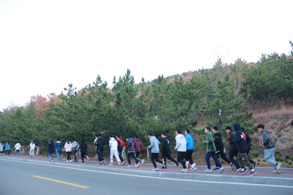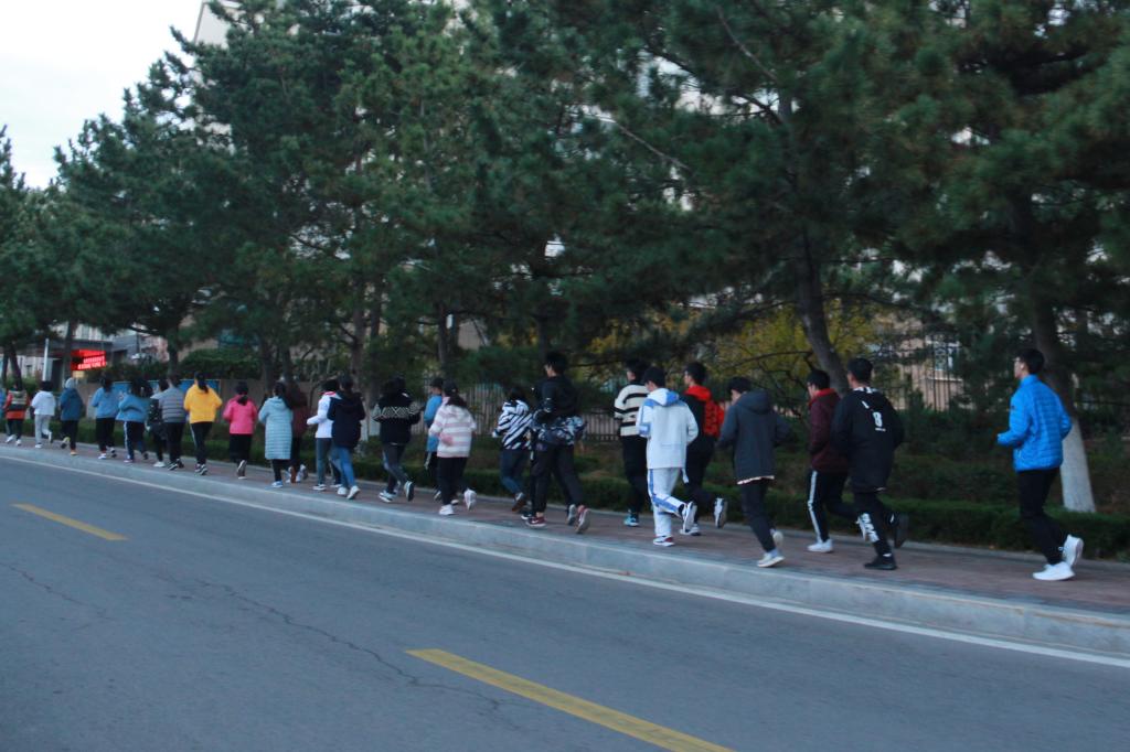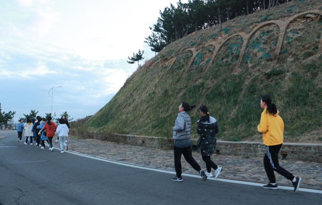 1115日与1122日清晨六点半,晨跑小队于蒙牛广场集合完毕。各部门部长统计核实好人数后,全体成员从学校西门出发,沿环海路奔跑,最后由北门返校。虽然两日天气比较寒冷,月亮还高悬天空,风也咄咄逼人,但是小队成员都面带笑容,满怀热情地参加了两次晨跑活动。途中,小队正面海风的阻挠,与路边树木相伴,与晨曦海浪为伍,迎接着太阳升起,井然有序,整齐且坚定地跑过环海路。成员们团结一致,互相帮助,心系彼此,确保每个学生不掉队、安全返校。成员彼此互相激励,带着良好的精神面貌,坚持着跑完全程,在清晨的初升阳光的照耀下返校。