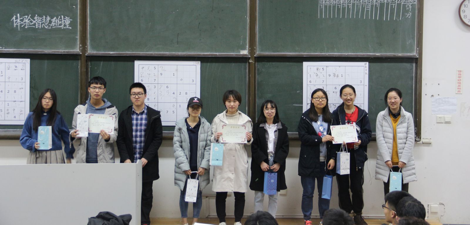 首先,卢晓燕向各参赛队伍介绍了比赛规则及注意事项。本次比赛共分三部分,第一部分是限时赛,包括4道数独题和3道填字题,得分占总成绩的60%。第二部分是趣味赛,每队领取一个立方体,立方体的六个面上贴着六道数独题,答案悬挂在教室前方的答案区域内。团队需合作填写立方体上的数独,并提交答案编号,本环节总分占总成绩的40%。比赛开始后,各队员争分夺秒、分工协作,有条不紊地进行答题。三十分钟后,比赛结束,所有团队结束答题。在互动环节,现场进行了有关甲骨文知识的抢答及字谜和歇后语的抢答,气氛活跃,卢晓燕为答对的同学发放了精美的小礼品。第三部分为展示赛,由前两个环节院内外得分第一的队伍与上一届冠军现场PK,对同一道题目回答正确且用时短的队伍获得终极大奖。最终,来自beat365中国唯一官网的“三剑客”队斩获一等奖和最具风采奖,2支队伍获得二等奖,3支团队获得三等奖。至此,本次填字数独大赛落下帷幕。
