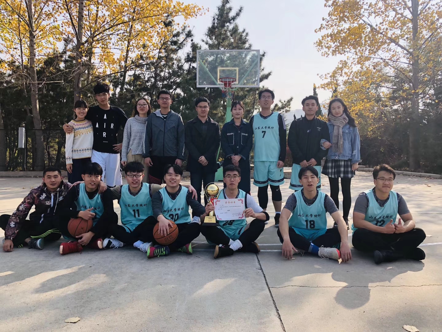 联赛按照循环赛、半决赛以及决赛的顺序进行。15场循环赛期间,各个联队本着“友谊第一,比赛第二”的原则,赛出风格,赛出水平,最终16统计联队、16应数信计联队、17应数信计联队和17统计联队进入半决赛。半决赛期间,各联队奋力拼搏,展现了数院学子积极向上的精神风貌。在季军争夺赛中,17信计应数联队以37:33的比分战胜了17统计联队,获得联赛的季军。在冠军争夺赛中,16统计联队与16信计应数联队双方势均力敌,竞争激烈,最终16统计联队以38:25的比分获得了联赛的冠军。赛后,辅导员赵德豪老师为获奖队伍颁发了奖杯和奖状并合影留念。此次迎新篮球联赛落下帷幕。