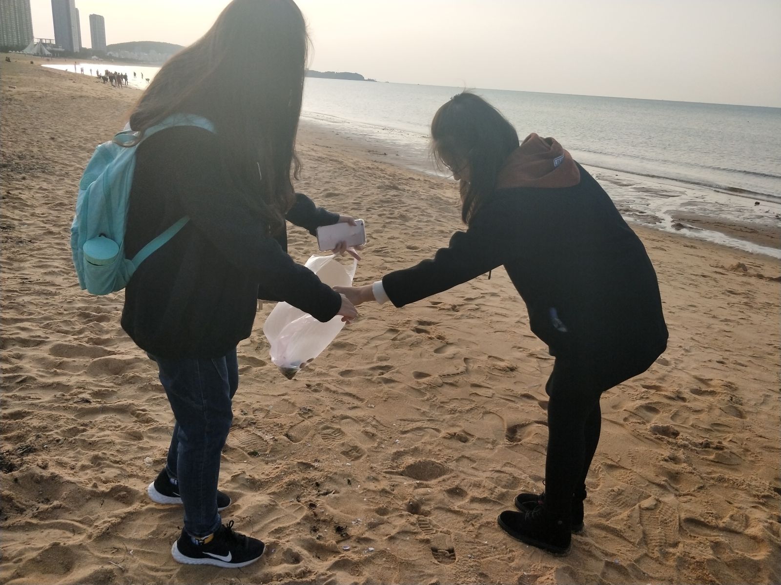 在活动开始前,就业委员在班级内下发了招募志愿者的通知,大家积极踊跃报名参加。首先,同学们于下午三点在24楼集合,由翟雨璇组织签到,带队到校外金海湾沙滩。翟雨璇将同学们带到沙滩边,并组织同学们进行海边合影。随后,翟雨璇同学以宿舍为单位为同学们分配负责区域。同学们纷纷开始自行清理自己负责的清洁区域。同学们沿海滩清理垃圾,在海滩边有烟头、包装袋、啤酒盖等垃圾,同学们一一捡起,不放过任何一处。最终,活动结束时,同学们手里的垃圾袋都装了不少的垃圾,将垃圾袋扔进了路边的垃圾桶。至此,“落日金滩,志愿共行”志愿服务活动圆满结束。
