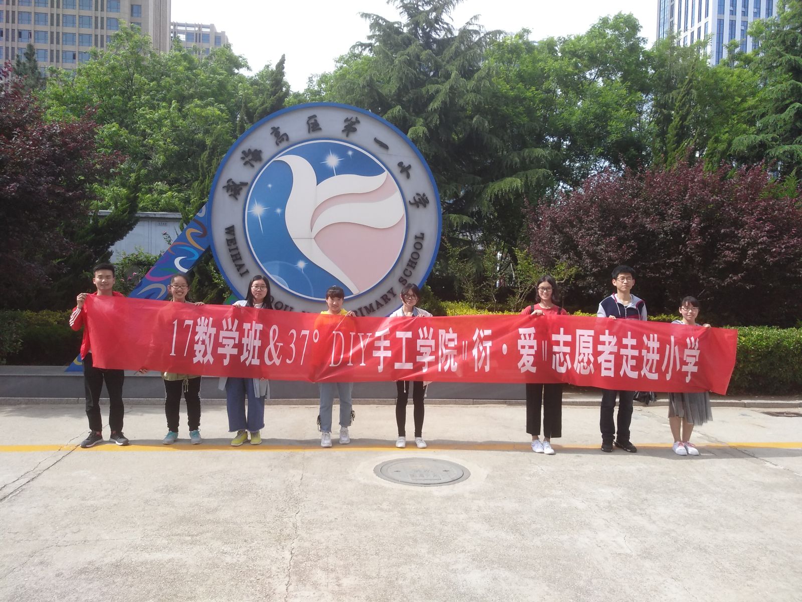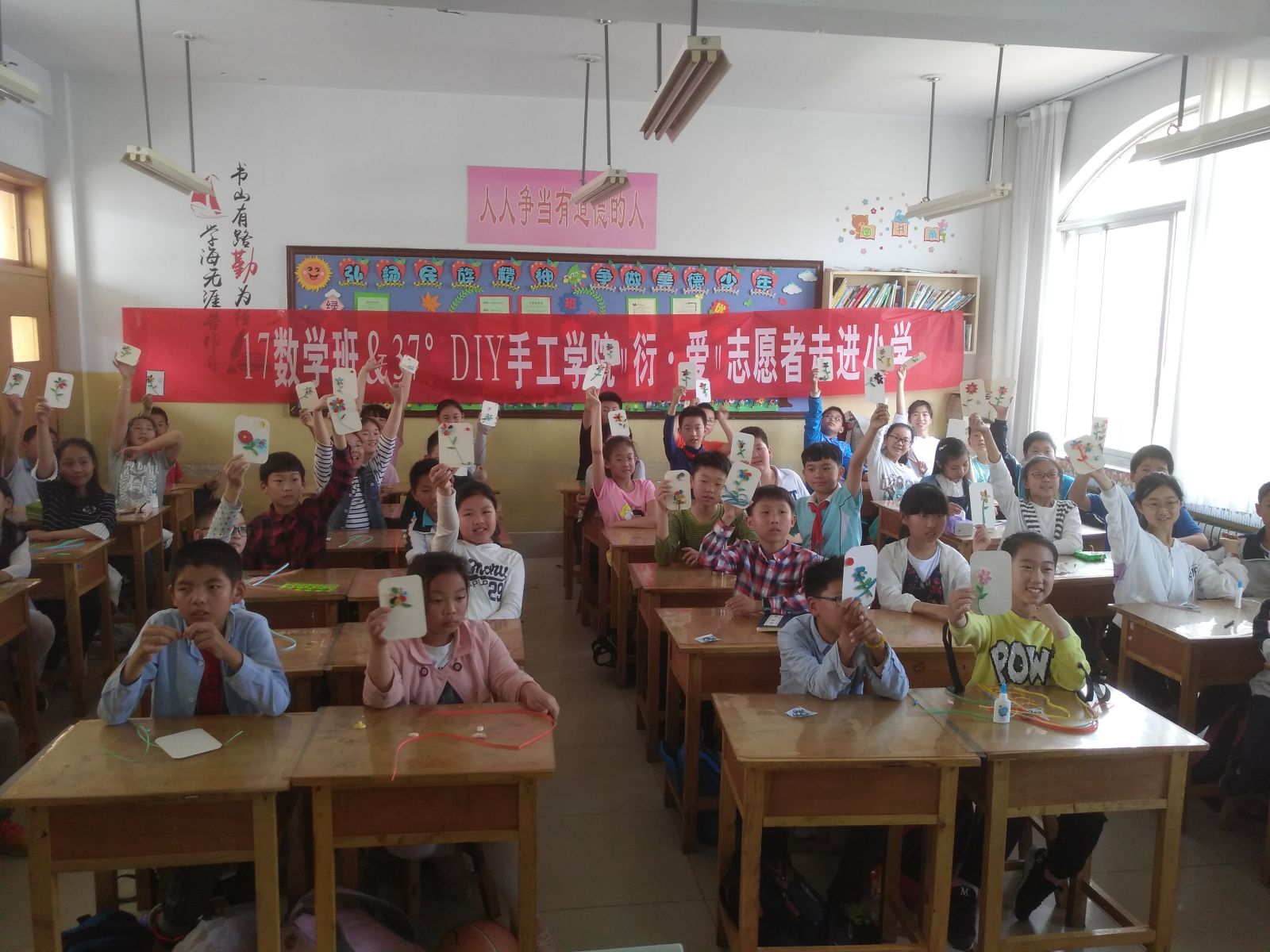 本站讯 2018年5月24日下午,2017数学与应用数学班携37°DIY手工学院成功举办“衍·爱”志愿服务第三项——走进小学。beat365中国唯一官网2017级部分成员参与了本次活动。本次志愿活动由就业委员魏佳佳、学习委员吕智超和beat365中国唯一官网(威海)孵化园37°DIY手工学院栾俊喜负责。