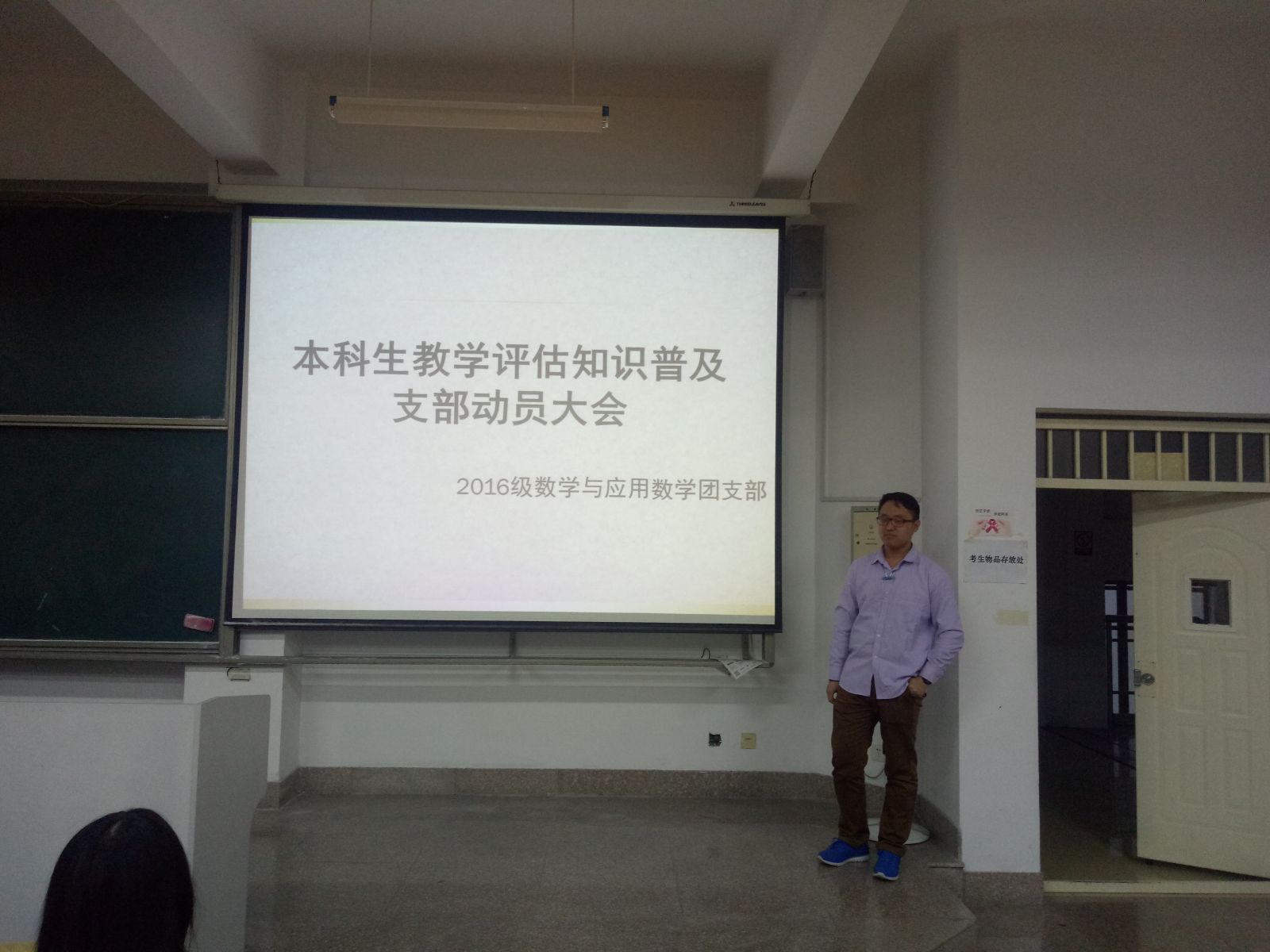 本站讯 2017年10月13日下午,2016级数学与应用数学班于图东206教室举办了“本科教学工作审核评估”动员班会。班级全体同学参加了此次班会,本次班会由班长王浩宇主持。
