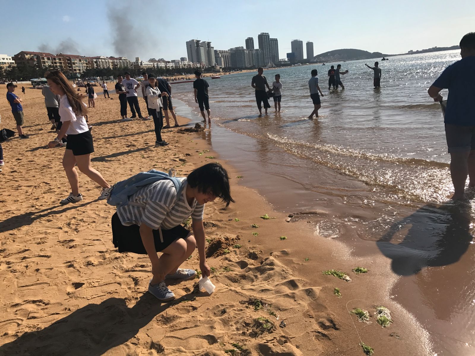 活动伊始,班级全体同学在蒙牛广场集合,由刘晨晨带领同学们前往海滩组织开展活动。同学们到达海滩后,以宿舍为单位进行分组并由各宿舍的舍长担任小组组长。随后,刘晨晨为各组派发了垃圾袋并说明了清扫任务,同学们按照指令到达指定位置后开始了各自的清扫任务。有的同学负责清理半埋在沙中的垃圾,有的同学负责将漂浮在浅滩附近海面上的垃圾收集起来,有的同学还主动帮助海边的清扫人员分担劳务。等到刘晨晨对各组负责区域检查完毕后,同学们都主动地将垃圾袋带回。虽然天气炎热但同学们都积极投身于劳动中,海滩在同学们的共同努力下变得更加干净。本次活动在同学们的辛勤劳动中落下了帷幕。