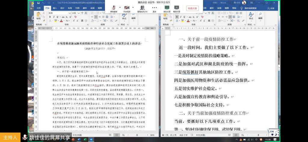 会议正式开始前,各成员进行签到活动,由综合事务部统计管理出勤情况。签到完成后,学生会主席魏佳佳简要概括本次会议的重要内容,并带领成员们回顾习总书记的重要讲话内容,鼓励成员们一定稳住心态、做好学习生活工作。随后,魏佳佳邀请各部门发表学习感悟。学习部王昕雨、科技学术部赵大成等代表做出发言,他们提出目前中国疫情正逐步好转,并且中国正积极帮助身处疫情的其它国家;我们应为党中央做出的工作感到自豪,并对解放军、医务工作者等奋战在一线的人员致敬。此外,他们希望各位成员不忘自身责任,坚决拥护党中央,并指出要乐观宽容、听从指挥。魏佳佳对各部门代表做出积极点评,并激励成员们要有民族凝聚力,不空谈感悟,而是落实到实际行动中。她指出每个成员应该从自身出发,增强自信心,避免过于保守,勇于表现自己。学习完成后,学团中心商讨主题团日的设计工作,魏佳佳提出继续坚持每日打卡先锋行活动等已开展的内容,督促各部门做好利用新媒体平台发出的宣传工作,建议部门间可以互相交流来更好地丰富主题团日活动。