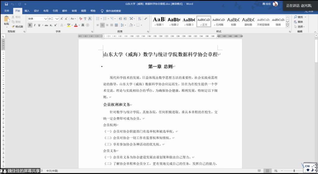 会议伊始,由主持人魏佳佳介绍本次培训会流程。之后,由望言辩论社数据科学协会会长分享各自社团的主题团日活动计划,从活动时间、活动流程、注意事项等方面详细介绍了所要开展的项目。赵德豪发表指导意见,指出各社团可以系统地进行线上主题活动的推送,在团支部内普及疫情相关知识,结合社团职能整理相关经验,并以写信的形式鼓励社员调整心态、认真学习。赵德豪指出,希望各社团骨干在此特殊时期能够积极落实、配合学校学院的工作,带领团支部成员积极度过疫情期。随后,望言辩论社与数据科学协会会长先后介绍各自社团规章制度,内容包括各学生社团总则、宗旨、设置及职能、日常管理制度等,方便老师提出指导意见。最后,社团骨干们对主题团日活动和规章制度所存在的问题进行研讨交流,赵德豪就奖惩及选举制度问题进行说明,魏佳佳对宣传问题及相关注意事项进行补充。
