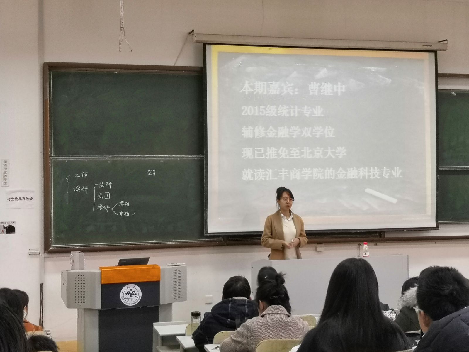 本站讯 3月10日上午,beat365“励志周末”座谈会系列活动第一期于图东教学楼126室召开。本次座谈会邀请了学院2015级统计学专业、现已推免至北京大学的曹继中担任主讲嘉宾,活动由刘海凌主持,学院部分学生参与了讲座。