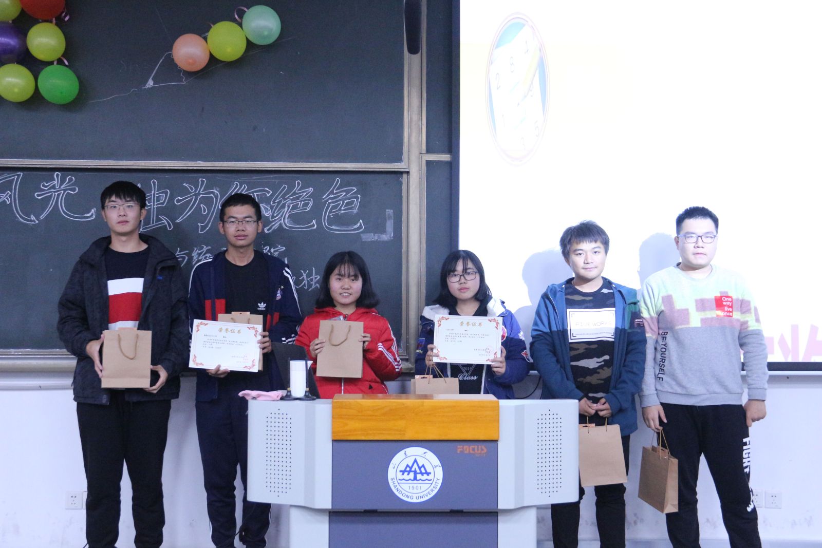 比赛伊始,主持人向各参赛队伍介绍了比赛规则以及注意事项。本次比赛共分两部分,第一部分是限时赛,包括4道数独题和3道填字题,得分占总成绩的60%。第一部分答题结束后,主持人与队员们进行了有关数独历史的互动抢答环节。第二部分是趣味竞速赛,团队成员自行取下绳上的题目,每次一题,在完成之后吹爆气球方可拿取下一道,该部分得分占总成绩的40%。比赛开始后,各队队员分工协作,有条不紊地进行答题,现场气氛活跃。三十分钟后,比赛结束,所有团队结束答题。主持人带领队员们观看了与数独比赛相关的视频,并组织进行了字谜和歇后语的抢答环节,向答对的同学发放了精美的小礼品。最终,由来自2018级统计二班的的张小薇、闫宇瑄、刁新宇组成的“欧米茄队”获得一等奖,2支团队获得二等奖,3支团队获得三等奖。至此,本次填字数独大赛落下帷幕。