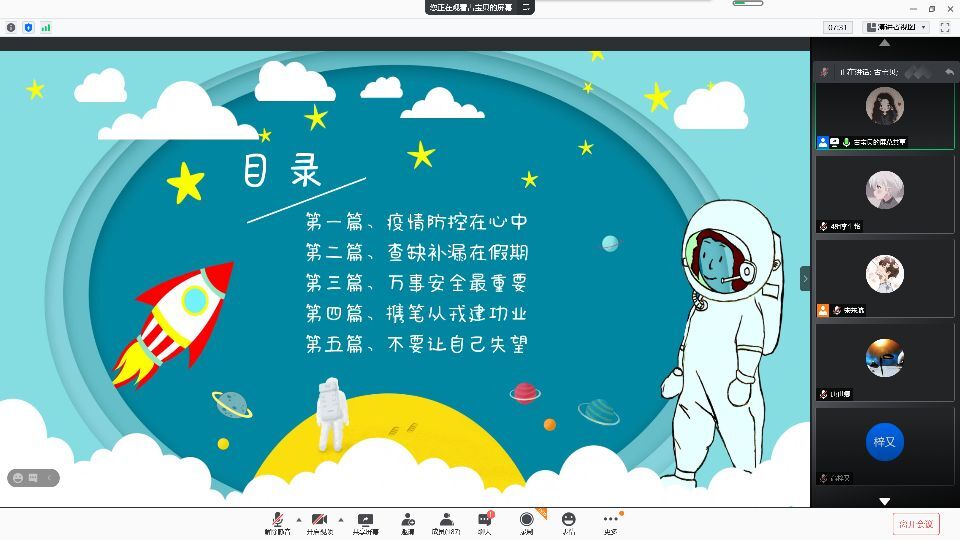 会议分了五个模块:疫情防控在心中、查缺补漏在假期、万事安全最重要、携笔从戎建功业、不要让自己失望。针对近期疫情形势,古钰提出,寒假期间同学们应尽量减少外出,避免聚集,非必要不出市、不出省、不出境,如需外出,则需要向学院报备审核;居家的同学应注意卫生,做好疫情防护。古钰着重强调了假期期间每日打卡的重要性,督促同学们做好假期打卡。除此之外,会议要求寒假社会实践应以安全为先,就近实践,不跨地市展开,一旦实践地点出现疫情,立即叫停或转为线上展开。