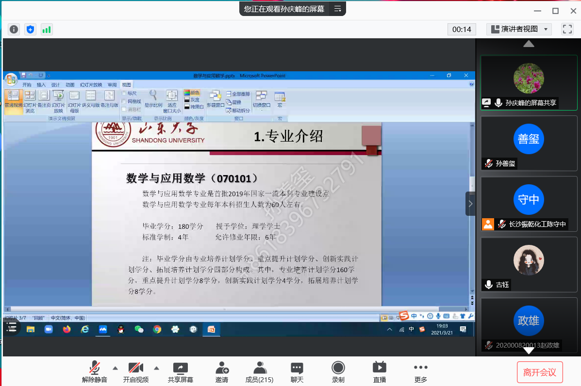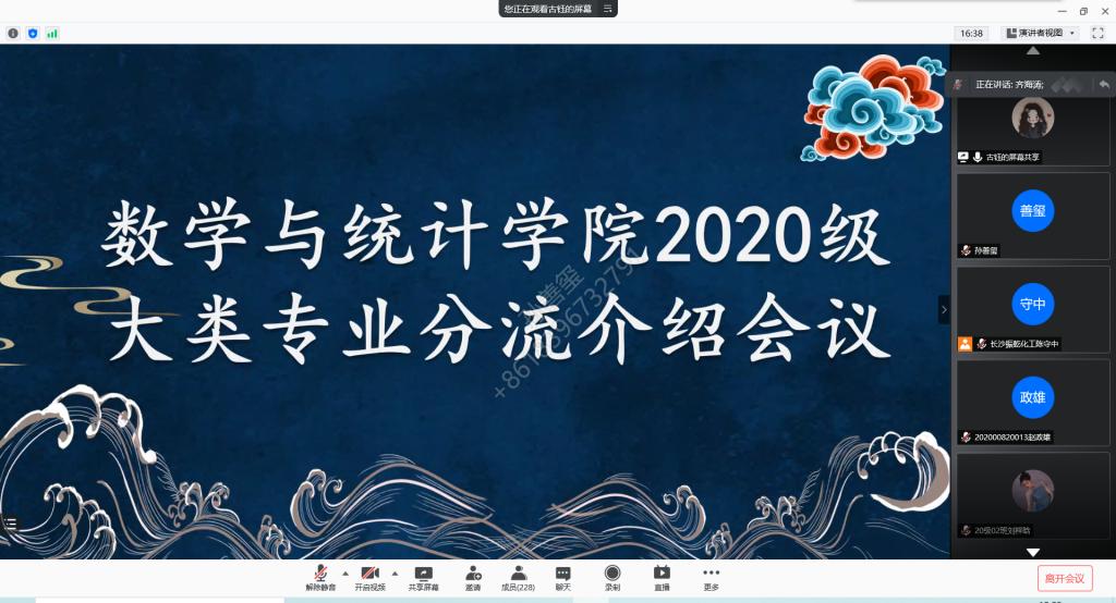 本站讯 3月21日,beat365中国唯一官网通过腾讯会议在线上举办2020级专业分流指导会。副院长齐海涛,数学与应用数学系主任孙庆峰、统计系主任王效强、信息与计算科学系主任张旭参加会议并作具体指导。指导会由2020级辅导员古钰主持。2020级全体本科生参加指导会。