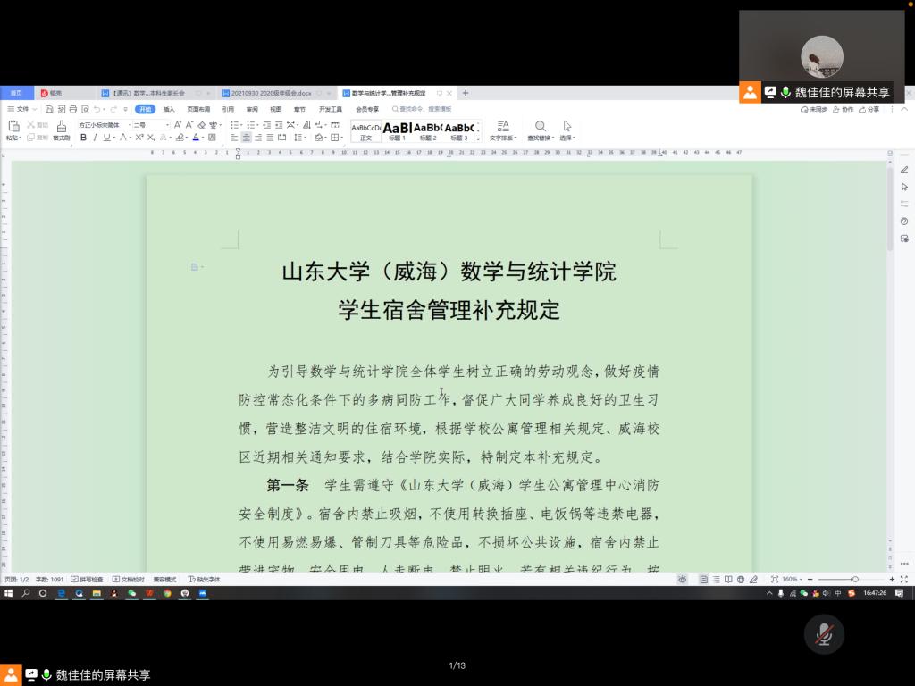 会议伊始,魏佳佳就评奖评优制度做出详细的解释,介绍了学业奖学金和特长奖学金的评定申请细则,提醒同学们在国庆假期期间提前准备相关材料。同时,她强调了体测成绩、志愿学时、宿舍卫生成绩对于评奖评优的重要性,鼓励同学们勇于尝试,积极申请特长奖学金和优秀学生干部。接着,魏佳佳着重强调宿舍卫生问题,提醒同学们注意日常宿舍消杀、开窗通风,加强宿舍管理,解释了文件《beat365中国唯一官网(威海)beat365中国唯一官网学生宿舍管理补充规定》中的具体管理规定。随后,魏佳佳重申疫情防控问题和安全问题。国庆假期期间,省外返校学生需做48小时内的核酸检测,同学们在校注意饮食安全用电安全,外出注意道路交通安全。就前一段时间的学习情况,魏佳佳点出了学习中依旧存在的纪律问题,提醒同学们从网课回归线下课程,及时调整心态,端正学习态度。最后,魏佳佳提出了日常学习生活中需要注意的事项,简单介绍了本学期之后的一些安排,计划以班级为单位,每月开展体育活动、主题团日活动,每周开展疫情防控知识宣传和心理健康知识普及,师生联合共同促进每位同学的健康发展。