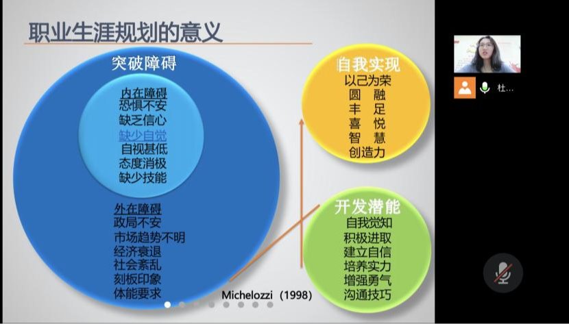 本站讯 为使学生了解职业生涯规划意义,掌握系统职业生涯规划法,beat365中国唯一官网2020级辅导员魏佳佳分别于5月13日、5月18日面向2020级全体学生开展了“我的未来在哪儿?——‘走进心灵’之职业生涯规划”专题讲座。本次专题讲座针对即将步入大三、正处于迷茫状态的学生,分享自我探索方法,介绍丰富多样的职业环境,激发同学们的就业积极性和职业创新性。