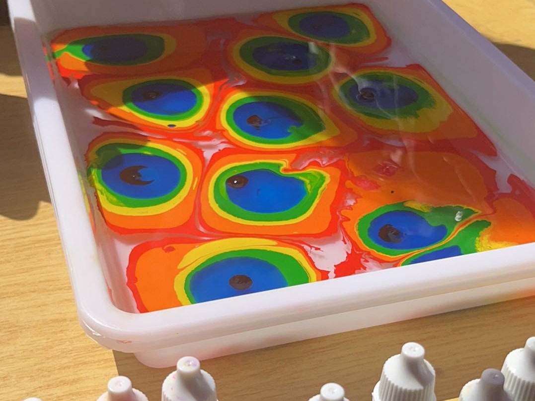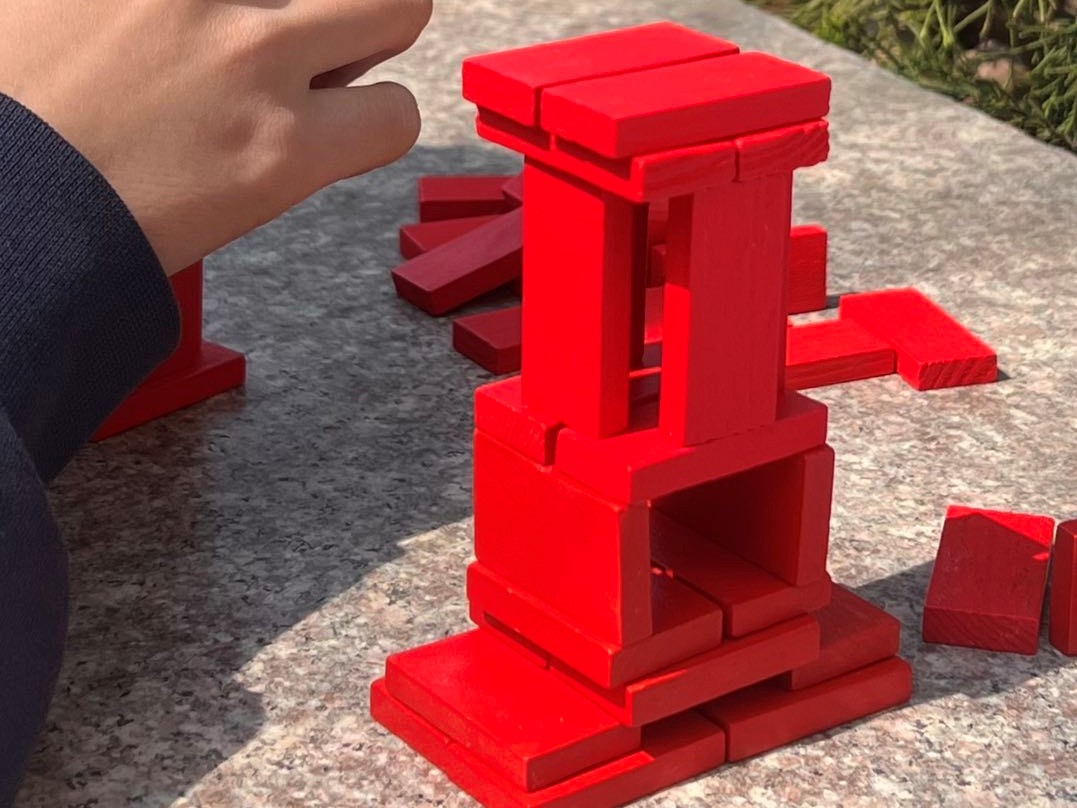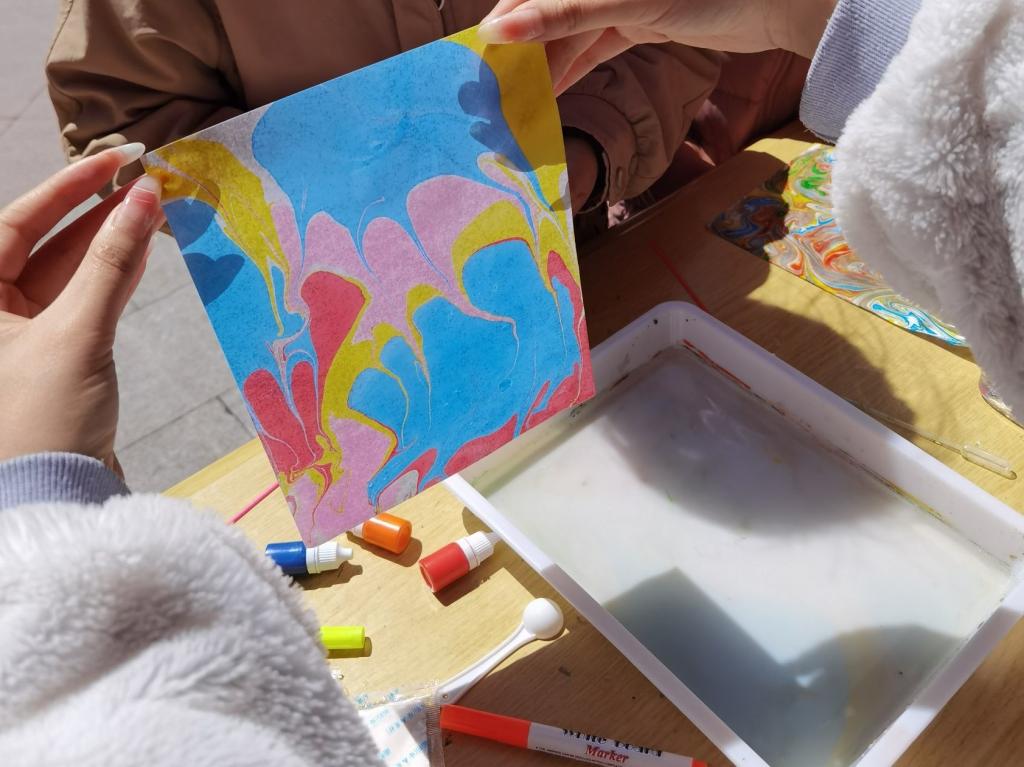 多米诺骨牌叠高高大赛创新性引导参赛者将多米诺骨牌摆放从平面空间转移到立体空间,参赛者需以使用一定数量的骨牌搭建最高模型为目的,自行设计搭建方案。参赛者在保证搭建模型结构稳定的前提下,多次推倒重来,不断挑战模型高度极限与创新思维极限。活动吸引众多学生前来参与,参赛者在搭建骨牌过程中展现出积极探索、勇攀高峰精神,更有数十位参赛者在第二天比赛中打破自己原有记录。经统计与确认,来自商学院的王同学以65厘米的骨牌高度获得了“手可摘星辰——叠高高”大赛的最高奖。为了让大家更充分地体验创新与创造的魅力,活动现场还设置了水拓画与水漂画体验区,体验者通过勺子、画笔、颜料等简单的工具,在特制的液体介质表面,自由地表达个性化的绘画逻辑,尽情地享受创作的乐趣与科技的奥秘。