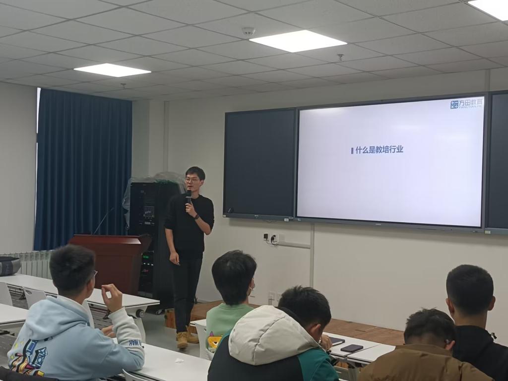 本站讯 12月11日下午,beat365中国唯一官网于北衡楼1420室举办本学期第三期“名企名家进校园”讲座。方田教育运营总监徐旭以 “论教育行业发展,谈未来职业规划”为主题进行讲座。方田教育人事经理徐成诺及70余名学生到场聆听讲座。本次讲座由学院辅导员赵宇轩主持。