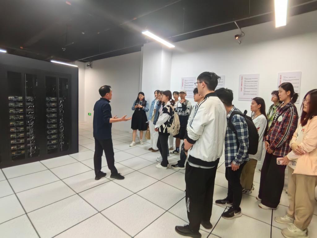 在技术专家的带领下,师生一行参观了位于联通云计算中心枢纽楼的主机房,深入了解其在通信稳定性保障、数据调度及应急响应等方面的重要作用。随后,技术专家围绕“云计算”这一核心内容,系统讲解了云计算的发展历程、核心架构及联通云的技术优势,重点介绍了其“安全可靠、云网一体、数智相融、多云协同”的平台特性。结合威海全域医疗云影像系统的建设实践,技术专家详细阐述了云计算在医疗领域的典型应用案例,展示了算网融合技术如何为智慧医疗和数据共享赋能,激发了同学们对交叉学科研究与实际场景落地的浓厚兴趣。