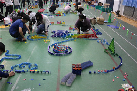 比赛伊始,主持人宣读了比赛注意事项并宣布比赛正式开始。紧接着,各参赛队在队长的率领下以视频或PPT的形式进行团队自我介绍,以展示团队风采。随后,各参赛队根据自己的设计图纸进行骨牌码放,限时90分钟。在这一环节中,参赛者积极投入,现场气氛紧张而不失活泼。期间还有多米诺骨牌相关知识的介绍以及国内外优秀多米诺骨牌作品视频的播放,这让同学们感受到了多米诺的魅力。骨牌摆放完毕后,由各参赛队代表对图形的寓意进行解说并推倒骨牌。随后,评委就团队自我介绍、骨牌图形设计、寓意解说、创意以及是否成功倒塌等方面进行打分。最后,翻译学院 “浪潮队”获得了本次比赛的一等奖。至此,数学多米诺骨牌大赛在观众热烈的掌声中落下了帷幕。