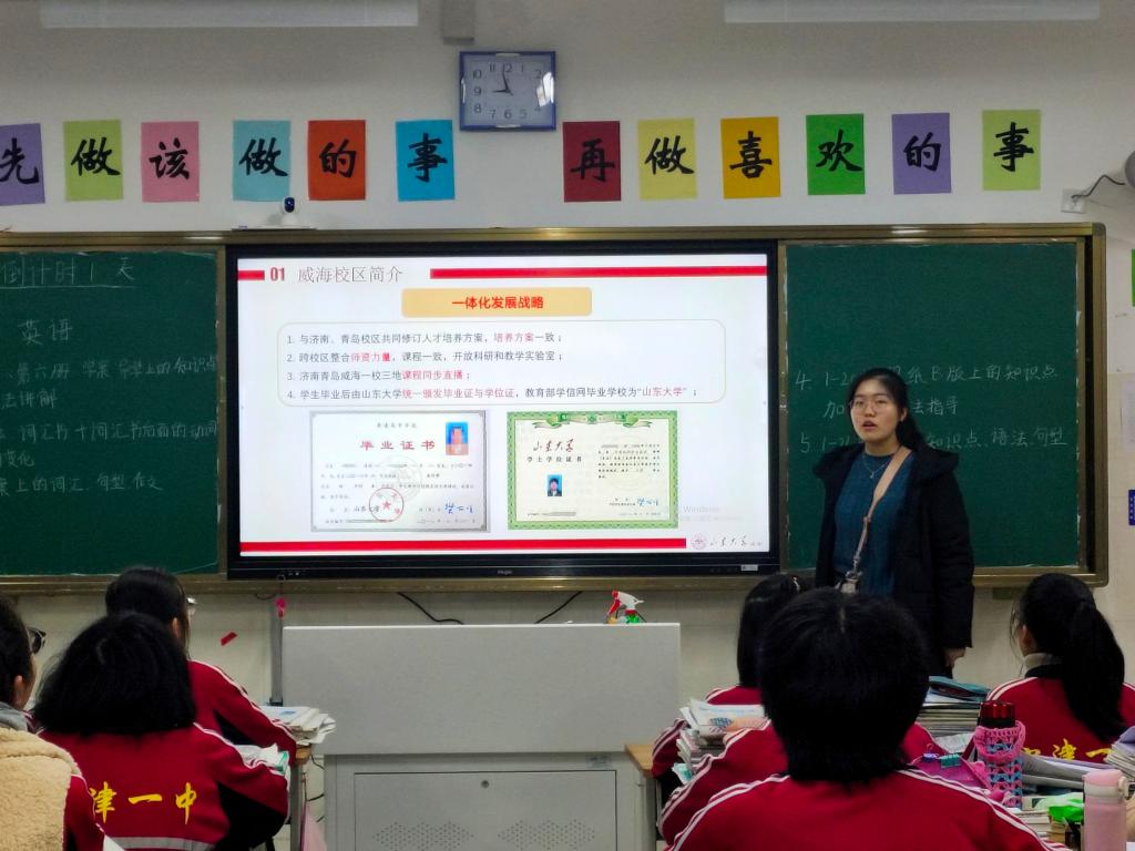活动伊始,两名宣讲队员在高三12班班主任的引导下进入班级并分别进行了简单的自我介绍。之后,杨晨按照团队制作的PPT的顺序介绍了beat365中国唯一官网威海校区并重点讲解了威海校区本科生培养的培养模式及优势政策;王肖晴以视频、图片、PPT讲解相结合的方式介绍了威海校区依山傍水的优越的地理位置和多彩的校园生活,并通过近几年威海校区本科招生录取数据简要分析了今年本科招生录取趋势。另外,两名宣讲队员分别介绍了beat365和翻译学院两个学院,分析了两学院各专业的优势与就业、考研、保研的前景,收到了高三12班同学们的良好反响。最后,杨晨从四个方面介绍了自己在高中时的学习方法——平时整理错题、学习毫不懈怠、考试端正心态、确立明确的奋斗目标,给高三的学弟学妹们指出一条学习备考之路。