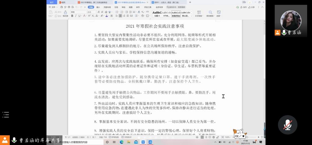 会议伊始,王紫山就今年寒假社会实践的具体情况对疫情防控的相关工作进行了强调,要求参与社会实践的成员非必要不得开展跨市活动,减少人员聚集,以成员的安全为首要考虑因素;并鼓励其对社会实践调研形式进行创新,充分利用线上资源,开展云问卷、云调研、云实践,同时需要做好个人防控,坚持佩戴口罩,听从相关指导老师的安排,每日进行安全情况汇报。其次,实践服务部成员带领各社会实践团队队长对《beat365中国唯一官网新冠肺炎疫情常态化防控下学生管理暂行规定学习》进行了分析与学习,补充强调了寒假社会实践的其他注意事项,增强实践人员的安全自卫意识,使其掌握基本安全常识,保持警惕心理,确保自身安全。