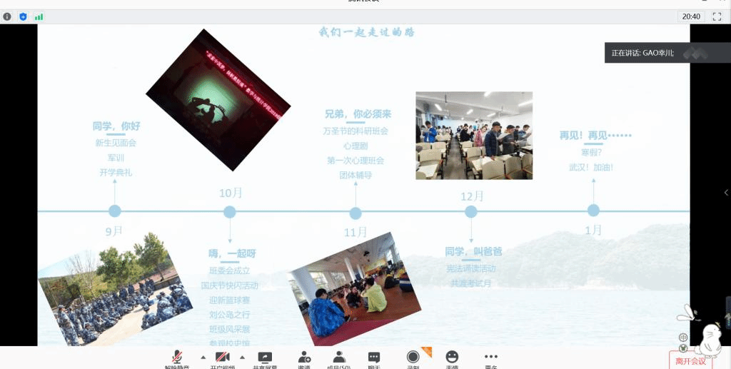 班会开始前,班长高锋提前征集同学们大一学期难忘的瞬间、要感谢的人以及难忘的小故事。会议伊始,同学们提前加入会议,观看准备好的小视频。视频记录了班中每个人最初的模样,使同学们怀念过去,想象开学时的快乐时光;紧接着,班长高锋展示班级同学们的分布图,开学时的报到,还有同学们的一些自拍;从相聚到相识,同学们观看大一学年度举办的活动线,从军训到风采展、再到团辅、心理剧……同学们感慨颇深,不禁潸然泪下。班长高锋朗诵着同学们写的故事,有对学校的赞美、对舍友的感谢还有许许多多的故事,让人泪目。之后,分别由心理委员李雯芊、宣传委员冯奥涵、团支书杨智捷、组织委员崔文慧和班长高锋朗读对自己工作的总结以及对同学们想说的话:最后,辅导员王祎璠和科研班主任陈琰钰对此次班会进行总结,鼓励同学们珍惜时间、勇敢追梦;辅导员王祎璠就一些工作问题及开学后的宿舍分配问题进行说明,班会结束。
