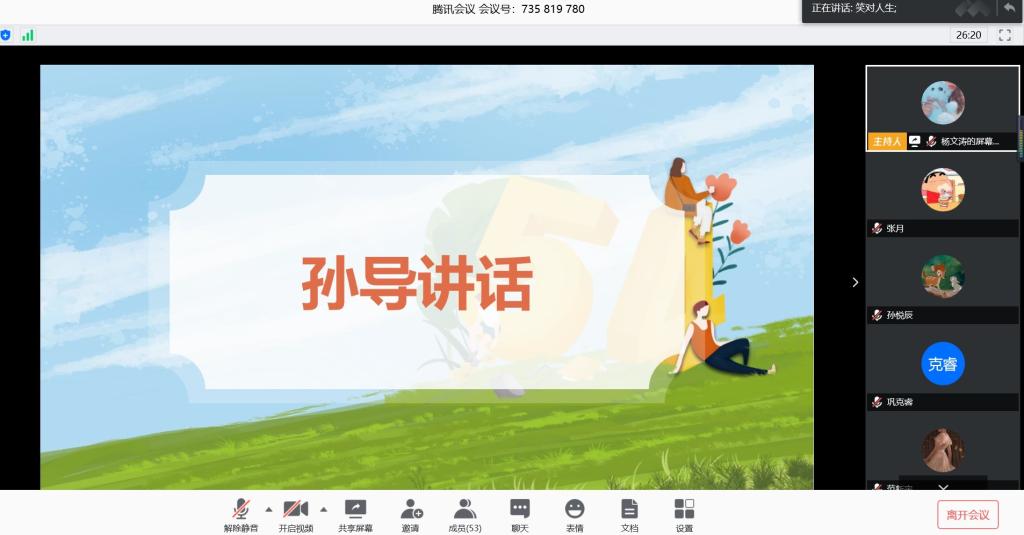本站讯 2020年5月4日上午10点,2018级统计学二班于腾讯会议举办“五四青年节”主题班会。本次班会由团支书杨文涛主持,辅导员孙磊,2018级统计学二班全体同学参加。
