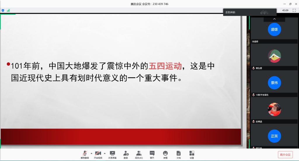 会议伊始,许鑫播放了一个关于五四运动电影剪辑的短片引出本次班会主题。播放完短片,许鑫向同学们对五四运动的背景、起因、过程、结果、意义等做了简单的介绍。在同学们重温了五四运动的知识之后,许鑫开始向同学们介绍五四运动的精髓——五四精神。许鑫介绍到,五四精神的核心内容为忧国忧民、热爱祖国、积极创新、探索科学的爱国主义精神,爱国主义是五四精神的核心与源泉。而五四运动的一切都是为了振兴中华民族。接着,许鑫向同学们发出号召纪念五四运动,发扬五四精神,我们应该为振兴中华民族而努力奋斗。然后,许鑫给同学们播放了一个关于当代青年人精神风貌的视频,让同学们看看观赏青年应该具有的精神风貌。班会最后,许鑫让同学们查收习总书记对于大家的寄语。班会结束之后,孙磊连接了麦克风对这次班会进行了总结。孙磊嘱咐同学们,开学的日期依旧遥遥无期,希望同学们牢记五四精神,沉下心来好好学习。