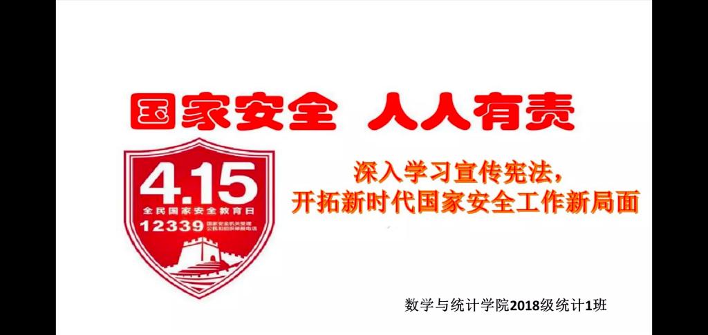本站讯 2020年4月16日下午四点半,beat365中国唯一官网(威海)beat365中国唯一官网2018级统计一班于线上开展国家安全教育日主题团日活动。4月15日为第五个“全民国家安全教育日”,本次主题团日活动主要目的为增强同学们的国家安全意识和法制观念,从而夯实国家安全的社会基础。本次活动由团支书秦千主持,统计一班58名同学参加。