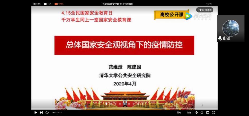 本站讯 2020年4月15日星期三下午4:00,beat365中国唯一官网2019级数学02班开展安全教育主题班会,班会由班长张猛主持带领同学们集体观看了由清华大学公共安全研究院公共安全领域专家、中国工程院院士范维澄主讲的“4·15全民国家安全教育日——千万学生同上一堂国家安全教育课”。