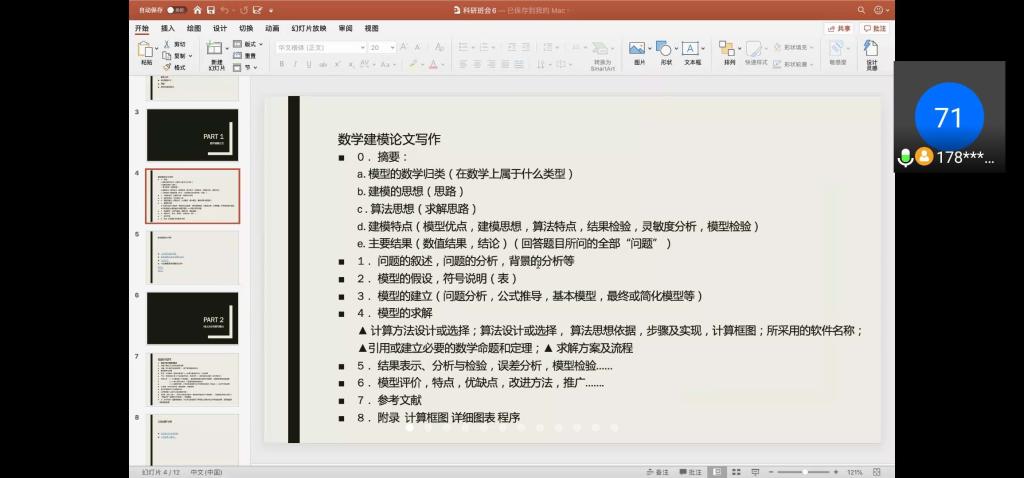 科研班主任李佳琪强调了前五次在科研班会中讲解过的重要模块后,以“科研立项中的细节 ”为主题,开展了此次第六期科研班会。首先,班主任向同学们细致详尽地讲解了如何书写数学建模的论文,罗列了数学建模论文写作中包括的部分,如摘要、问题的叙述、模型的假设、模型的建立与求解等等,通过举出论文内容中细小却又重要的小问题,分享了检查答卷时的注意事项。接着,班主任对于如何用word编辑论文进行了建议和经验分享,例如使用样式、编号、绘图、公式等,还推荐了一些非常有用的参考书。在这之后,班主任在创业计划书撰写要点进行了详细的讲解,以“挑战杯”创业计划大赛为例,对于比赛内容、计划书内容、注意事项等方面分享了许多建议,同学们从中学到了很多。然后,班主任在制作ppt方面进行了详细的讲解,针对ppt的构图布局、文字字体、图片规格等,推荐了许多ppt模板的网址。最后,班主任针对同学们提问的问题,尤其是大一下学期马上要面临的专业分流问题,以及考研、保研等问题,班主任认真回答,分享了自己的专业所学与亲身经验,为同学们答疑解惑。