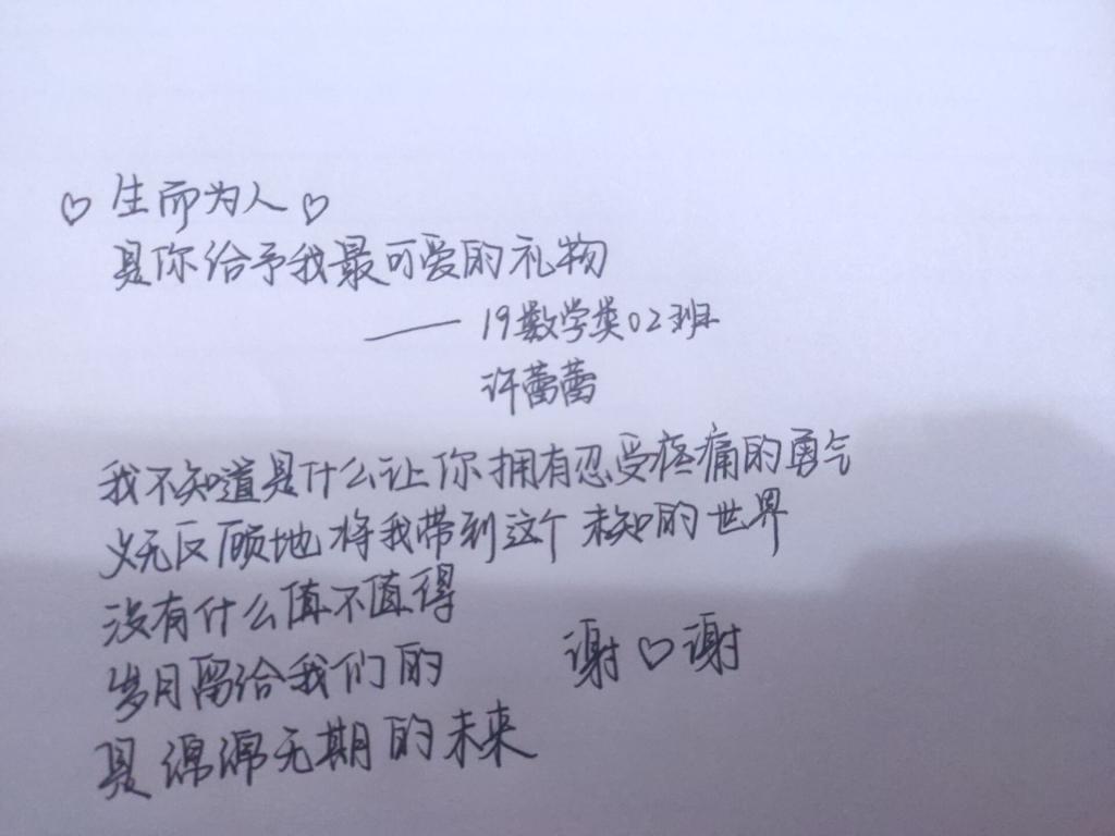 本站讯 2020年3月8日“国际妇女节”,beat365中国唯一官网2019级数学类02班在就业委员王晨湾的带领下,积极开展了“祝母亲妇女节快乐”手写祝福活动。活动通过每位同学手写小诗或祝福语,来表达对母亲的爱与感激之情,祝母亲们妇女节快乐。活动由就业委员王晨湾开展,2班全体同学参加。