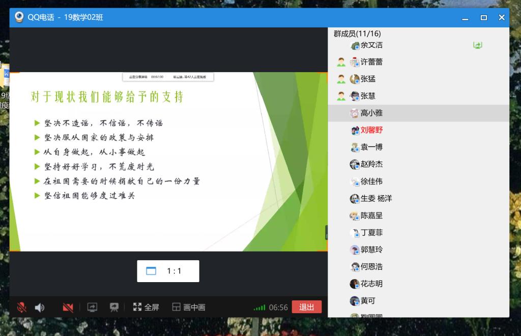 班会伊始,学习委员赵羚杰对同学们的到勤情况进行检查后,班委对同学们进行了疫情时期的鼓励与慰问,班长张猛说明会议目的以及举办线上会议的需要。心理委员缪凌宇结合PPT和大家一起进行疫情知识的学习,学习内容分为两个方面:对于新型冠状病毒肺炎的认识,与对于现状我们能够给予的支持,基本内容包括新型肺炎的定义、流行病学的调查、患者的症状和相应的保护措施等。学习结束后,班委呼吁大家好好利用假期,不荒废时光,并提出几条可行性方法;也呼吁大家要坚信祖国和祖国人民,服从各个地区的安排,积极配合,同舟共济。会议的最后,进行互动环节,大家自由发表对祖国的祝福等,并且有惊喜的彩蛋环节——向大家征询更多精彩的不同形式的班级线上活动,并提出几条可行性建议。
