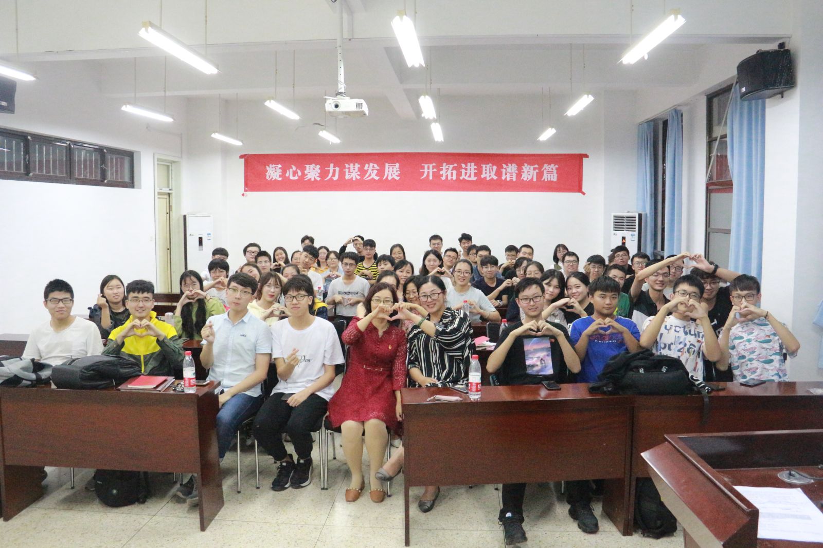 伴随着献礼祖国70周年短片的播放,九位老师在纪念章的传递中陆续入场,吕靖宣布本次主题团日活动正式开始。此次活动主要有:观看视频、合唱国歌;了解活动、听歌识曲;教师分享、师生共话和合唱校歌、合影留念这四个环节。大家首先通过视频回顾了共和国这70年的披荆斩棘、风雨兼程,然后全场师生起立高唱中华人民共和国国歌,表达对祖国母亲70华诞的衷心祝愿。18信息团支部委员会从庆祝中华人民共和国成立70周年百首优秀歌曲中,精心挑选了其中的十首并截取片段来供大家竞猜,老师和同学们积极参与,争先抢答。接下来,吕靖邀请到场的九位老师为同学们讲述他们心中祖国的进步。老师们从自身经历出发,分别从交通工具的变化,通讯工具的进步,生活质量的提高等不同方面感慨短短七十载祖国变化之巨,并表达了对祖国未来的期待。最后一个环节,全体同学和老师结合樊丽明校长在2018本科生新生开学典礼上发表的题为《带着梦想去奋斗》的讲话及“我”、“祖国”、“新时代”这三个关键词进行了小组讨论。曲刚同学和秦立振同学代表小组上台展示了讨论的结果。党支部教师代表亓兴勤老师总结到:“爱国其实离我们并不遥远。对于大家来说,爱岗敬业,做好本职工作,其实就是爱国。